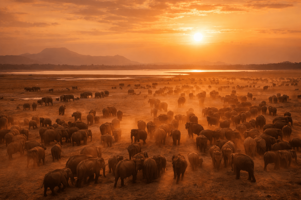 Minneriya, lui, est célèbre pour le ‘Grand Rassemblement’ de juillet à octobre : jusqu’à 300 éléphants sauvages se retrouvent autour du réservoir asséché pour boire et socialiser. C’est l’un des spectacles naturels les plus extraordinaires d’Asie — et il se produit sans aucune intervention humaine, sans captivité, sans exploitation.