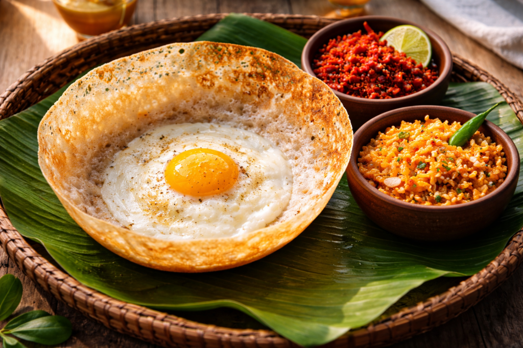- Les Hoppers (Appa) : Ce sont des crêpes en forme de bol, préparées avec une pâte fermentée à base de farine de riz et de lait de coco. Les bords sont croustillants et le centre est moelleux. La version la plus populaire est le Egg Hopper : un œuf est cassé au centre pendant la cuisson. On le mange avec du Lunu Miris (pâte d’oignon et piment).