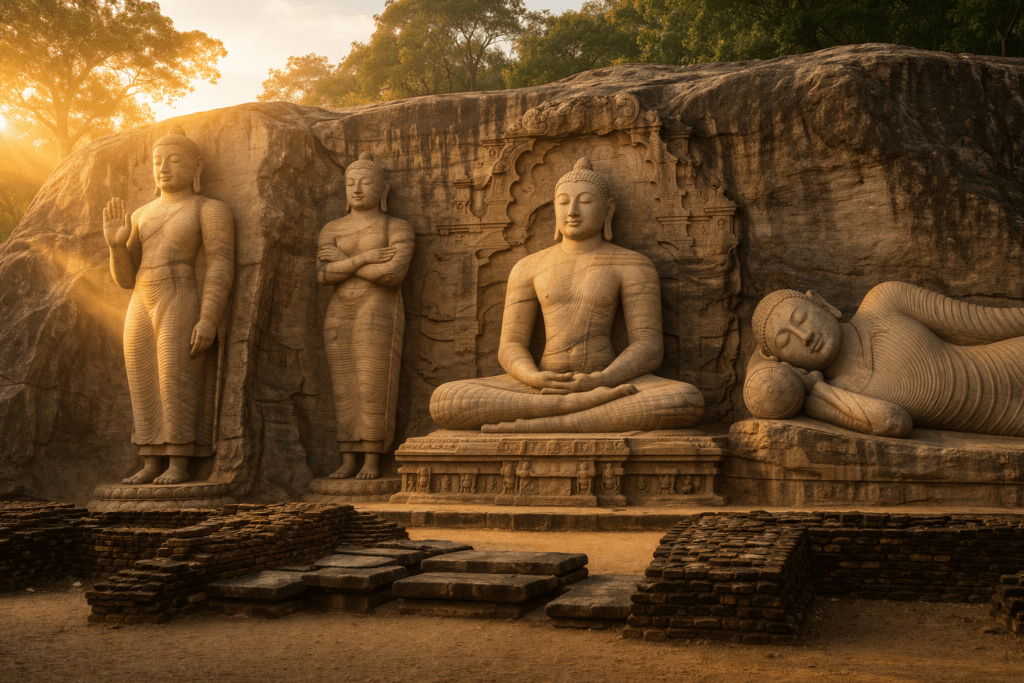 ⭐ Ce qui rend ce site unique : Quatre figures bouddhistes monumentales taillées directement dans une seule falaise de granit — la Bouddha assis en méditation (4,6m), le Bouddha debout (7m), le Bouddha couché dans le parinirvana (14m), et une figure plus petite dans une niche. C’est l’accomplissement artistique le plus extraordinaire de toute la civilisation médiévale cingalaise. La précision des détails — les expressions faciales, les plis du vêtement, les proportions parfaites — après 900 ans est proprement stupéfiante.